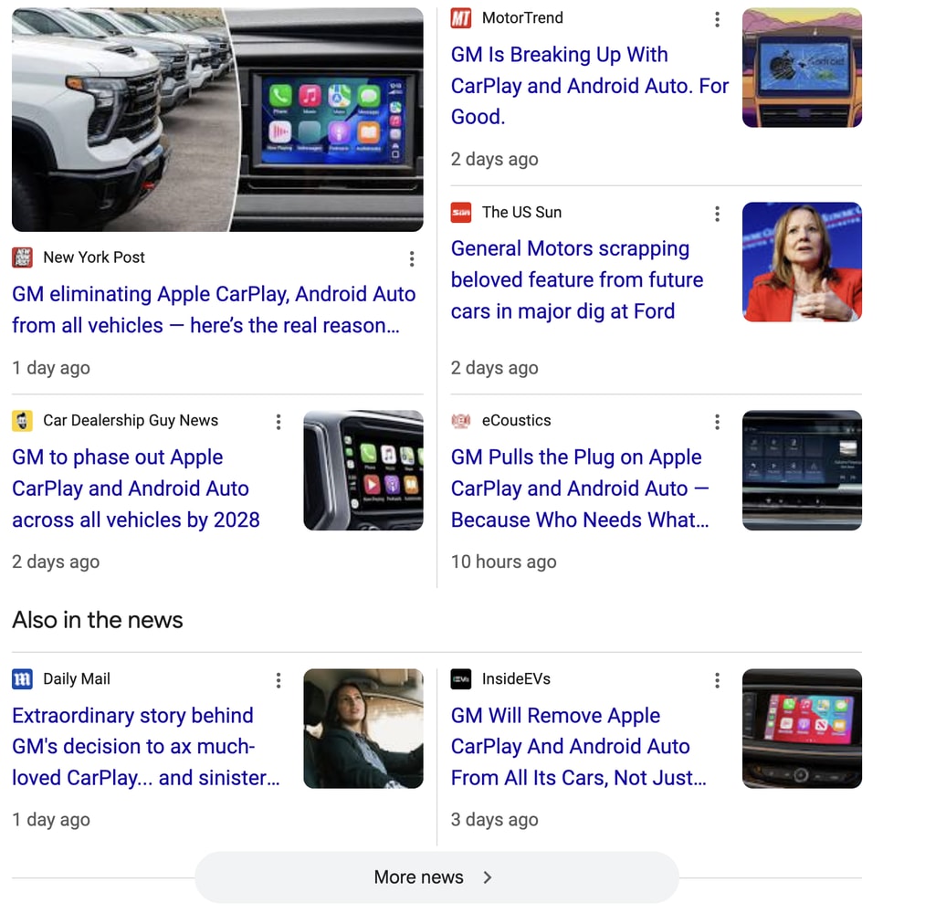 “Barra confirmed GM will eventually end support of Apple CarPlay and Android Auto on both gas-powered and electric cars. The timing is unclear, but Barra pointed to a major rollout of what the company is calling a new centralized computing platform, set to launch in 2028, that will involve eventually transitioning its entire lineup to a unified in-car experience.”