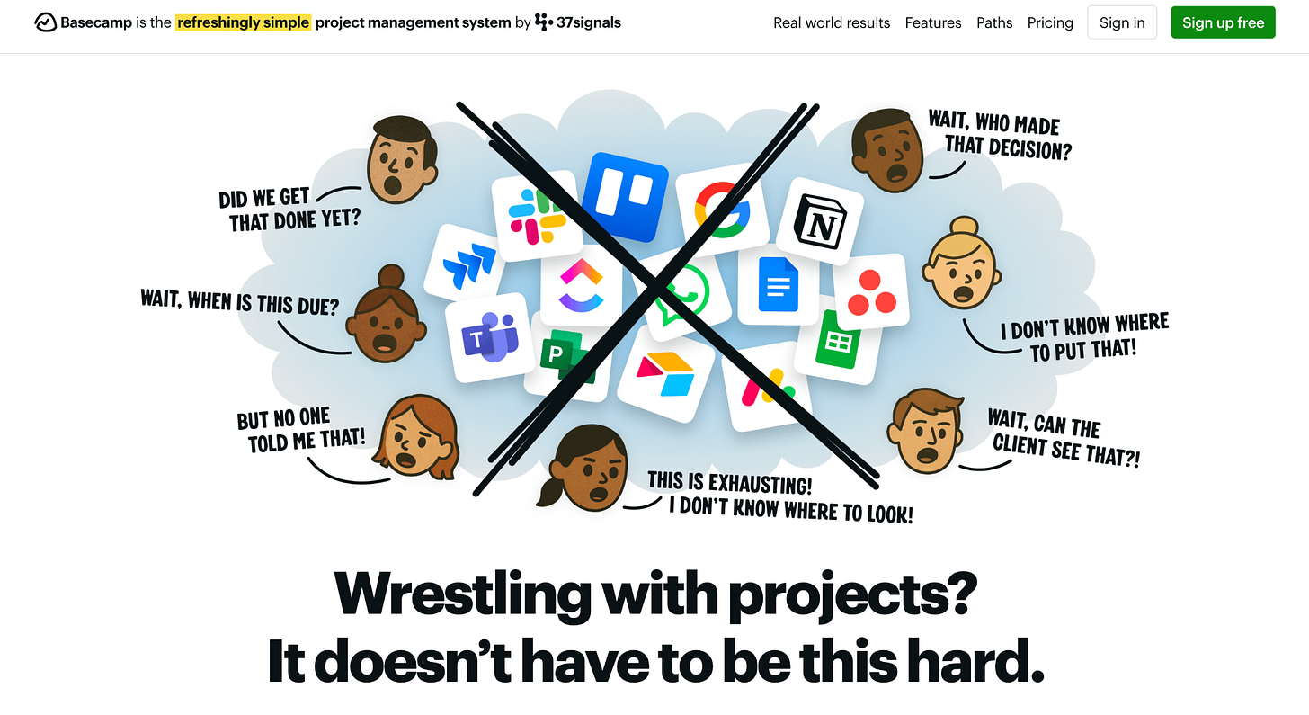 Basecamp doesn’t say “we’re cheaper than Jira.” They say that project management software shouldn’t require a training manual. The framing positions the incumbent’s bundle as wasteful or presumptuous, not premium.